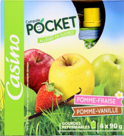 Compote Pocket Refermable Allégée en Sucres Pomme-Fraise -Vanille – Casino – 4 x 90g