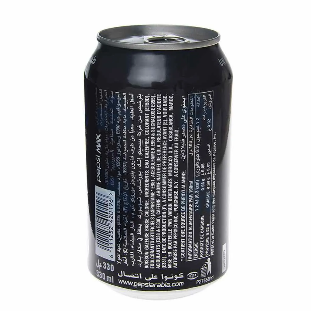 Canette de boisson gazeuse sans sucre Pepsi. Contenance : 330ml. Sans sucre avec un max de goût. À conserver dans un endroit frais.